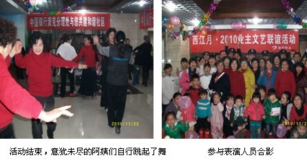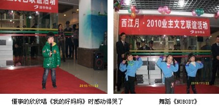 为增进业主间邻里友谊,促进物业与业主间的感情交流,丰富小区业主业余文化生活,西江月物业服务中心于2010年11月27日举办了以“业主物业一家亲,共建和谐小区”为主题的业主文艺联谊活动。此次活动主要形式为文艺表演,得到了各种年龄阶层特别是老年朋友们的积极参与,活动现场热闹非凡,到处洋溢着快乐的气氛。