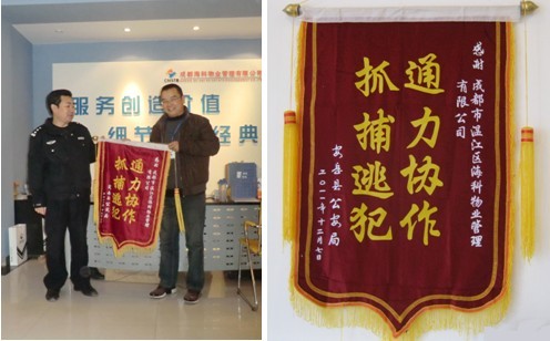 12月3日,经过前期缜密侦查和艰苦的蹲点守候,安岳县公安机关在海科物业所属的某物管小区内抓获1名网上通缉逃犯。安阳岳县公安机关在该小区侦察和蹲点守候期间,海科物管各岗位工作人员严守秘密,密切配合,在成功抓获逃犯的过程中表现出了较好的专业素质。为了感谢海科物管公司工作人员的支持与配合,安岳县公安局有关领导专程到海科物管公司赠送锦旗和感谢信以示警民协作的谢意。