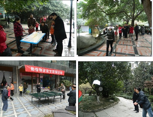 我公司组织了10多项业主游园活动游戏。活动当日,小区业主扶老携幼积极参与,共同分享一场丰富的社区文化盛宴。“猜谜”这边迷友冥思苦想;“蒙面敲锣”那边欢声笑语不断;“下象棋”人们鼓足腮帮;“打乒乓”现场热情似火;“掷飞镖”大家一丝不苟,抽奖活动更是把节日气氛推向了高潮,丰富的游戏使现场的节日气氛格外喜庆、热烈。