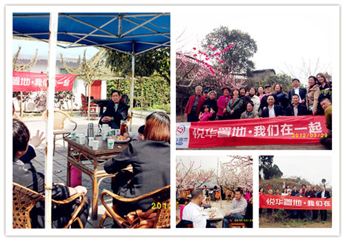 在成都龙泉驿的桃花节上,由悦华置地物业公司“悦生活”艺术团与四川公司管理服务的清河阳光、白兰地、弗客城、艺水芳乡、学府尚郡、上行汇锦、花溪谷七个小区部分业主组织了龙泉桃花节茶话会活动。赏桃花:在粉红色的花海中,业主们留下了一张张灿烂的笑脸;茶话会:拉家常,扯八卦——原本钢筋水泥中的冷漠,在大家的欢声笑语中被融化,悦华置地物业公司与业主们的距离在此刻拉近……