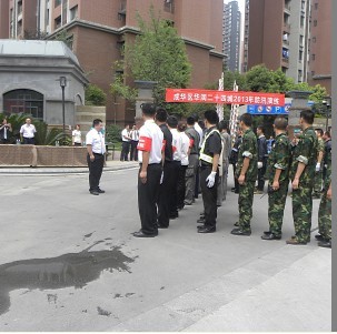 此次演习诚邀成华区政府领导、成华区房管局物管科领导、公司蒲总以及成华区物业同行近200人到场参观,本次演习总指挥由一期项目苏经理担任,共设立:联络组、客户组、工程组、抢险组、抽排组等8个小组。经过精密的安排部署,28日下午15:00演习正式开始。参观人员被参演人员热情饱满的精神面貌,列队后整齐一致的团队形象深深的震撼。在苏经理的指挥下,各小组成员迅速到达指定地点,开始行动,客户部负责通知地下车库车主将车辆移出;工程部负责检查水泵排水情;抢险组负责现场抢险、疏导车辆交通、警戒现场……一切都有条不紊的进行。随着一声“报告总指挥车辆已经疏散完毕,现场汛情已经排除,园区设备总体完好,无电梯受损,无人员受伤,现场秩序井然。车辆疏散完毕,无车辆受损。是否可以结束抢险,请您指示!”宣告本次演习顺利结束。其后市房管局唐主任对此次演习进行了点评和表扬。