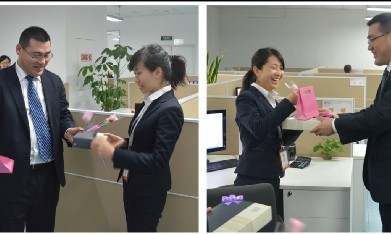 而合能物业女性职员,在这一天也收到了一份别样的惊喜。早上,办公区飘起了浪漫的背景音乐,公司领导为办公室女士送上象征甜蜜、幸福的巧克力、鲜花等节日礼物。