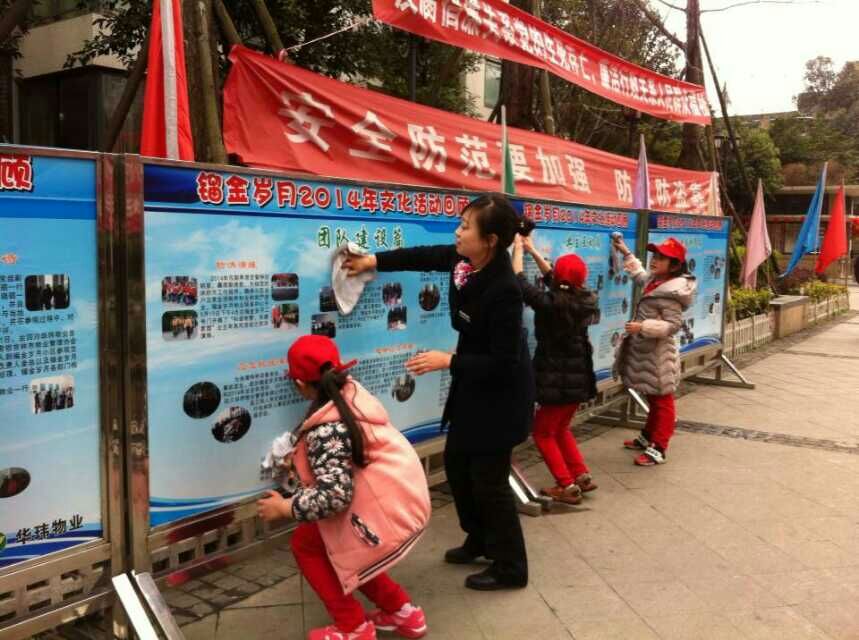 活动期间,业主志愿者、物业志愿者、成师附小慧源校区教师学生志愿者,还在镏金岁月小区开展“清洁小区公共环境”志愿服务活动。志愿者们积极参与到公共区域的卫生大扫除中,将小区里的道路扫的干干净净。小学生们在老师和志愿者阿姨的带领下,提着水桶打水、拧帕子,将花台大理石围边擦的一尘不染,连低杆灯、垃圾桶他们也“不放过”,擦的仔仔细细,认认真真,成了小区里面一道亮丽的风景线。