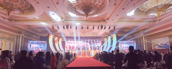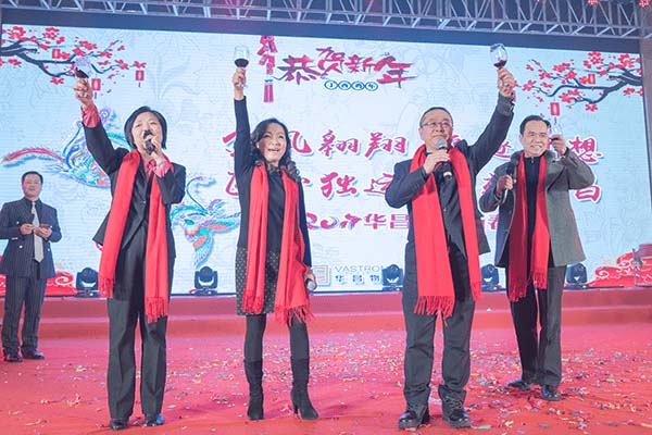 年会全部环节结束后,华昌物业为员工们准备的年会晚宴也开始了。经营班子成员总经理庞琳先生、副总经理张富英女士、副总经理曾光德先生和副总经理田敏女士登上舞台,向华昌员工和特邀嘉宾致祝酒辞,恭祝大家阖家幸福、新春快乐!并提议大家一起高举酒杯,为“每一个华昌人幸福的生活、为华昌物业的美好明天”干杯!