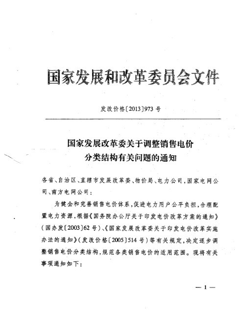 国家发展改革委关于调整销售电价分类结构有关问题的通知