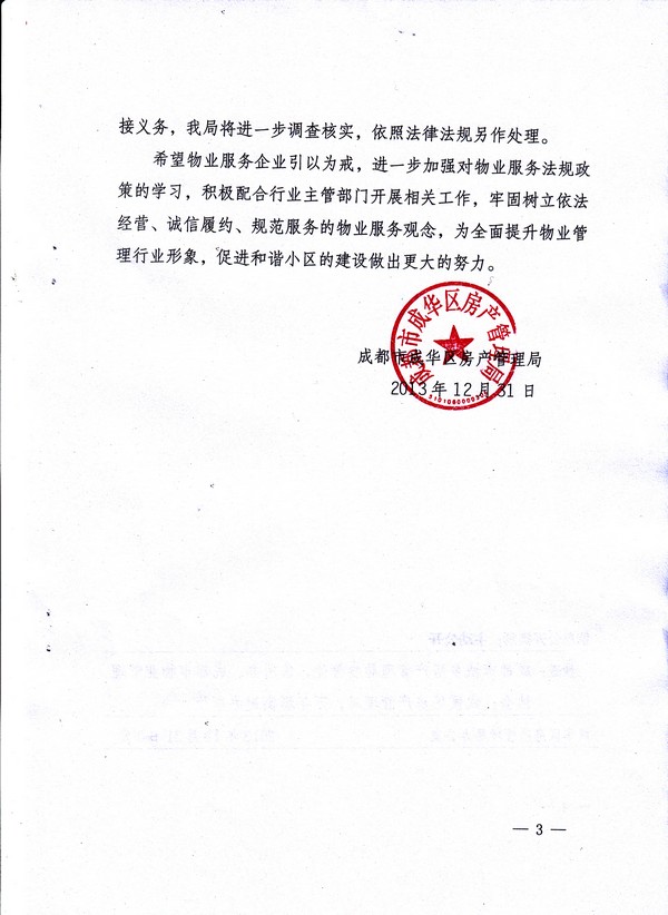 上一条:关于命名表彰成都市(首批)物业服务品牌企业的决定 下一条:关于认真做好元旦春节期间物业管理区域相关工作的通知