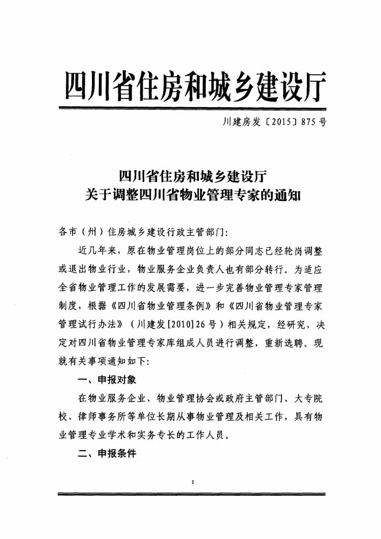 附件:四川省住房和城乡建设厅关于调整四川省物业管理专家的通知(川建房发〔2015〕875号)