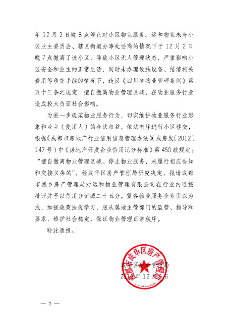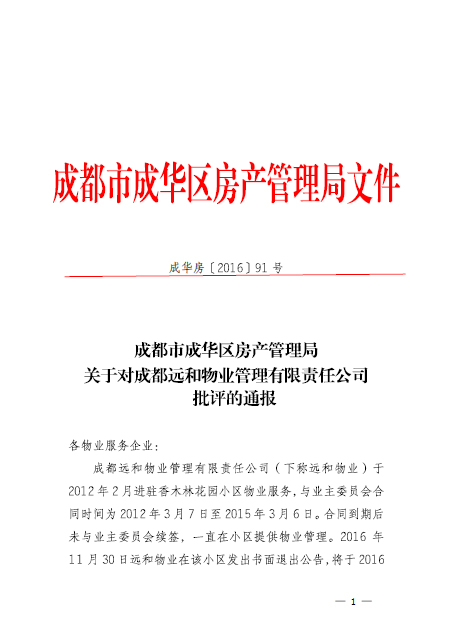关于对成都远和物业管理有限责任公司批评的通报