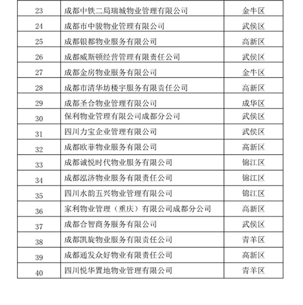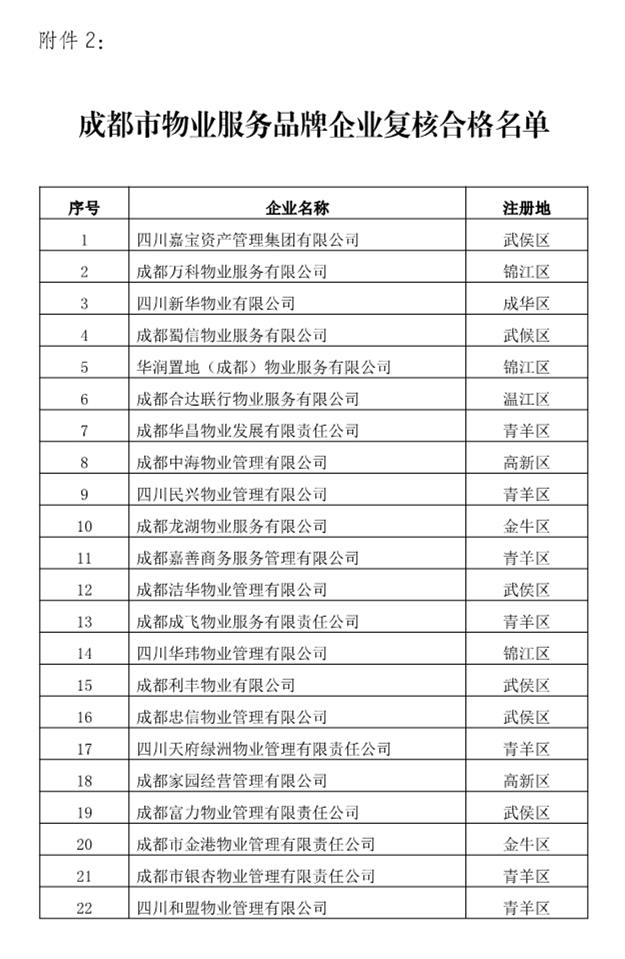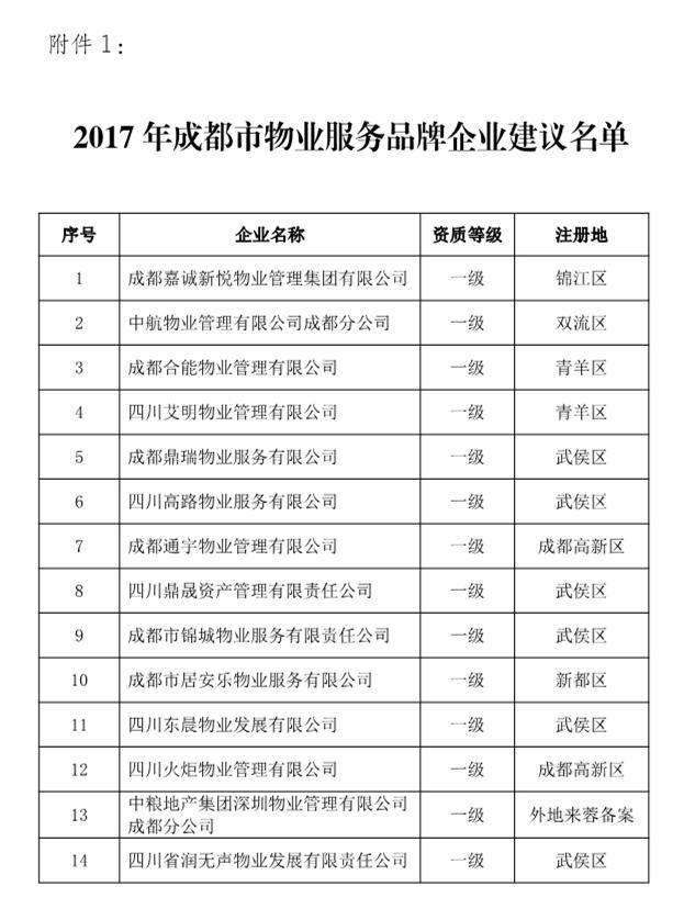 根据《成都市物业管理行业品牌建设工作指导意见》(成物协〔2015〕11号)和成都市物业管理行业品牌建设委员会《关于开展2017年成都市物业服务品牌企业评定工作的通知》(成物品牌委〔2017〕1号)相关规定,经评定及复核,成都嘉诚新悦物业管理集团有限公司等14家物业服务企业评定合格,进入品牌企业建议名单,四川嘉宝资产管理集团有限公司等40家品牌企业复核合格。现予以公示,公示时间为2017年12月29日至2018年1月5日。如有异议,请于公示期内以实名书面形式反馈至品牌建设委员会秘书处。