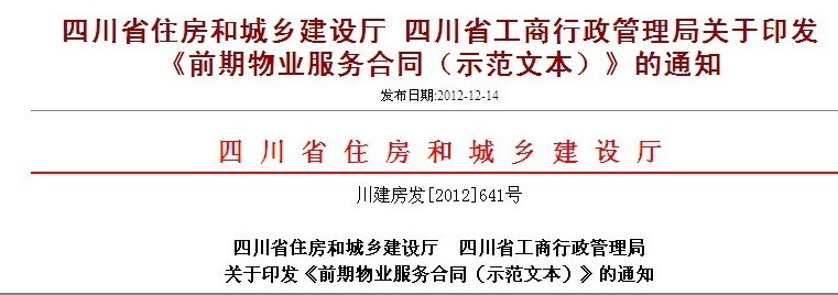 为贯彻落实《中华人民共和国物权法》、国务院《物业管理条例》和《四川省物业管理条例》,规范全省物业管理活动,维护各方主体的合法权益,促进社会和谐,推动物业管理工作健康、有序发展,我们制定了《前期物业服务合同(示范文本)》,现印发你们,供建设单位与物业服务企业签约使用。