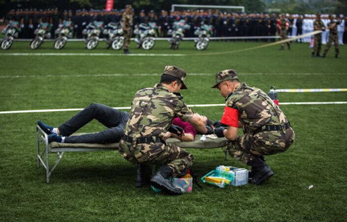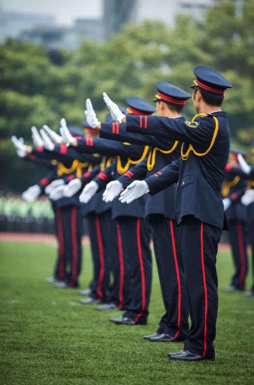 在竞赛的第二个科目交通指挥手势演练环节,各支队伍别出心裁,将单调的交通手势与秩序维护工作中的特点结合,经过精心编排,形成一套极具观赏性的手势操。参赛人员在领队的口令下,动作整齐划一、铿锵有力,展示了秩序维护队员们平日里兢兢业业工作积累的成果。